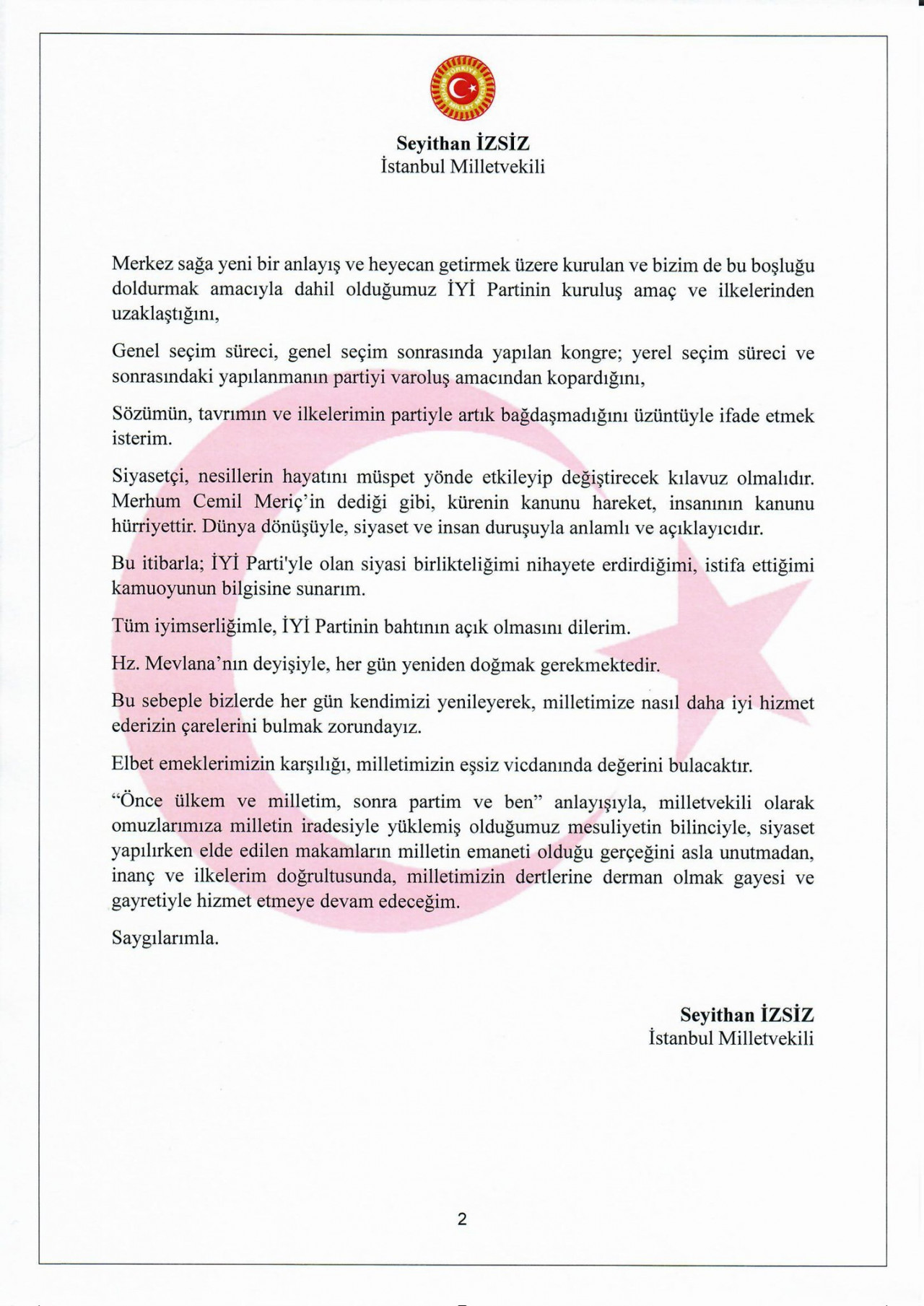 "Genel seçim süreci, genel seçim sonrasında yapılan kongre, yerel seçim süreci ve sonrasındaki yapılanmanın partiyi varoluş amacından kopardığını, sözümün, tavrımın ve ilkelerimin partiyle artık bağdaşmadığını üzüntüyle ifade etmek isterim. Siyasetçi, nesillerin hayatını müspet yönde etkileyip değiştirecek kılavuz olmalıdır. Merhum Cemil Meriç'in dediği gibi, kürenin kanunu hareket, insanının kanunu hürriyettir. Dünya dönüşüyle, siyaset ve insan duruşuyla anlamlı ve açıklayıcıdır. Bu itibarla İYİ Parti'yle olan siyasi birlikteliğimi nihayete erdirdiğimi, istifa ettiğimi kamuoyunun bilgisine sunarım."