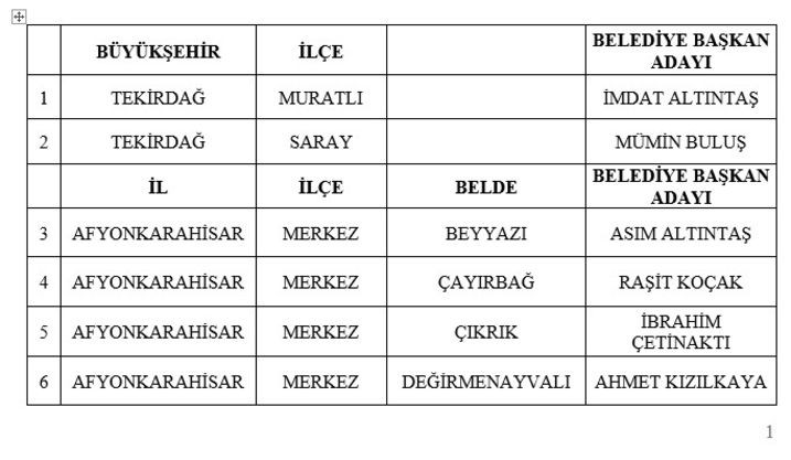 MHP'den yapılan açıklamada, "Partimizin yetkili kurullarının yapmış olduğu değerlendirme ve Genel Başkanımız Sayın Devlet Bahçeli'nin onayları sonucunda 31 Mart 2024 Mahalli İdareler Seçimlerinde 10. etap olarak adaylıkları kesinleşen 2 Büyükşehir ilçe, 53 belde belediye başkan adayımız olmak üzere toplam 55 adayımızın isim listesi aşağıdadır" denildi.