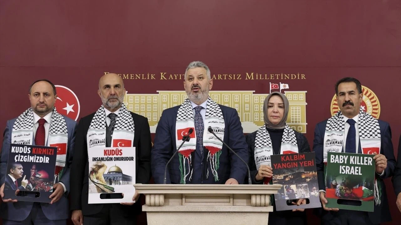 AK Parti'li milletvekilleri basın toplantısına "Kudüs kırmızı çizgimizdir", "Kudüs insanlığın onurudur", "Özgür Kudüs", "Kudüs özgür değilse dünya tutsaktır" ve "Kudüs yürek yangınımızdır" yazılı dövizlerle katıldı.