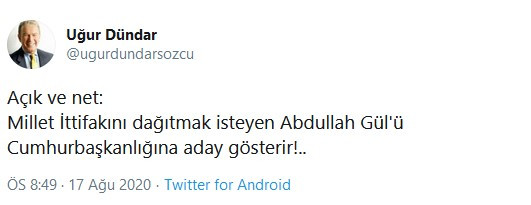 Kılıçdaroğlu’na tepki gösteren isimlerden biri de İslam düşmanlığıyla ünlenen Uğur Dündar oldu. Sözcü yazarı Dündar, Twitter hesabından sert bir mesaj yayınladı. Mesajında Dündar, “Açık ve net: Millet İttifakını dağıtmak isteyen Abdullah Gül'ü Cumhurbaşkanlığına aday gösterir!..” ifadelerini kullandı.