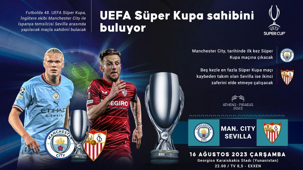 Geçen sezon İstanbul'da oynanan UEFA Şampiyonlar Ligi finalinde zafere ulaşan Manchester City ile UEFA Avrupa Ligi'ni kazanan Sevilla'nın karşılaşacağı Süper Kupa maçı, Yunanistan'ın Pire kentindeki Georgios Karaiskakis Stadı'nda TSİ 22.00'de başlayacak.
