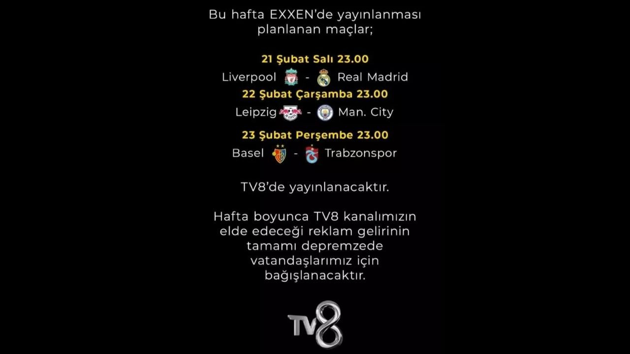 EXXEN platformunda yayınlanan maçların bu hafta TV8'de yayınlanacağını duyuran Acun Ilıcalı, hafta boyunca TV8 kanalının elde edeceği reklam gelirinin tamamının depremzede vatandaşlar için bağışlanacağını duyurdu.