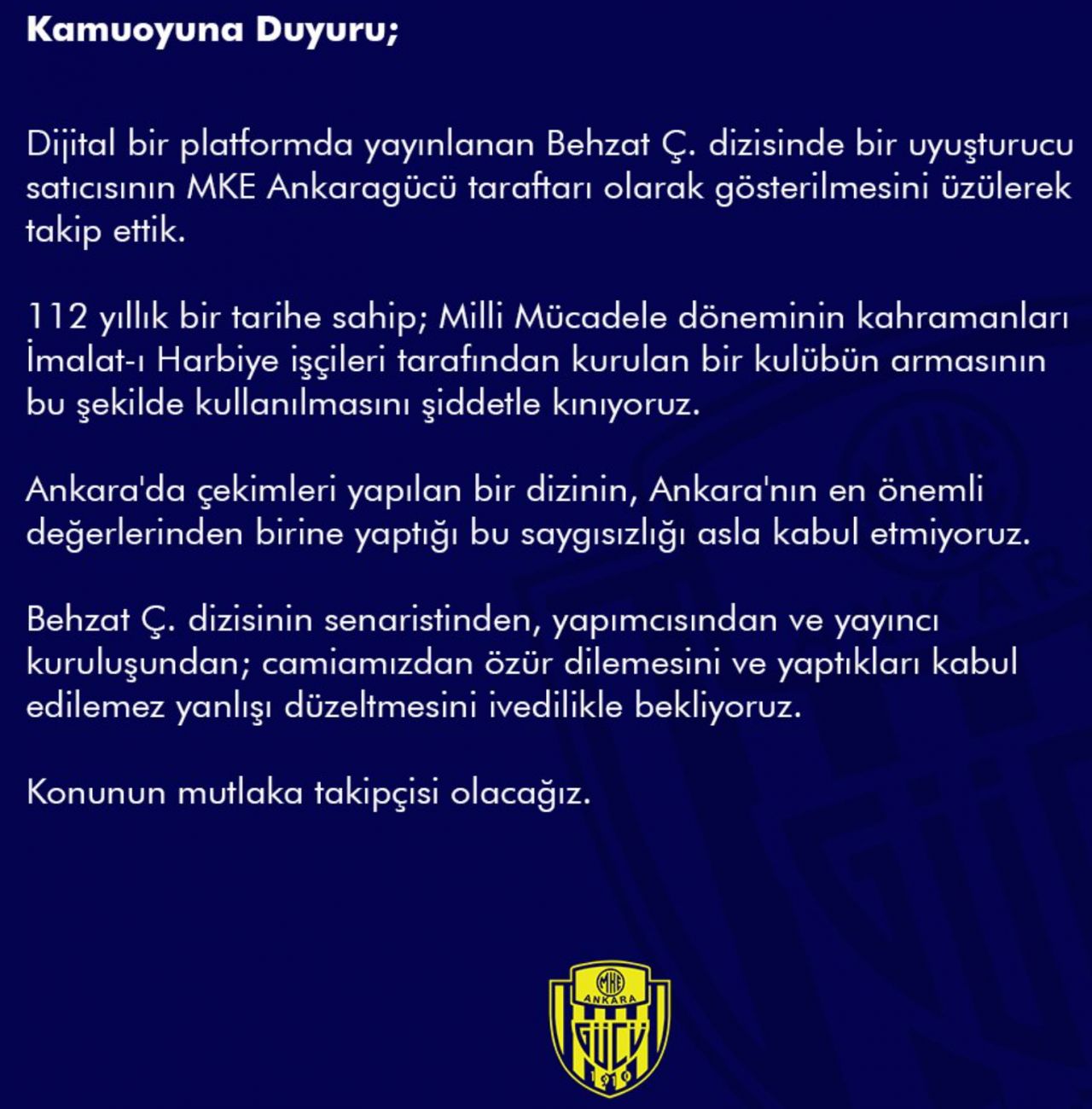 "Dijital bir platformda yayınlanan Behzat Ç. dizisinde bir uyuşturucu satıcısının MKE Ankaragücü taraftarı olarak gösterilmesini üzülerek takip ettik. 112 yıllık bir tarihe sahip; Milli Mücadele döneminin kahramanları Imalat-ı Harbiye işçileri tarafından kurulan bir kulübün armasının bu şekilde kullanılmasını şiddetle kınıyoruz. Ankara'da çekimleri yapılan bir dizinin, Ankara'nın en önemli değerlerinden birine yaptığı bu saygısızlığı asla kabul etmiyoruz. Behzat Ç. dizisinin senaristinden, yapımcısından ve yayıncı kuruluşundan; camiamızdan özür dilemesini ve yaptıkları kabul edilemez yanlışı düzeltmesini ivedilikle bekliyoruz."