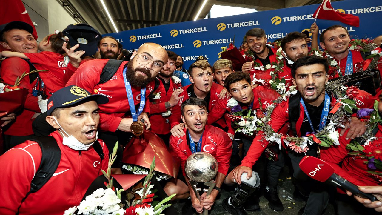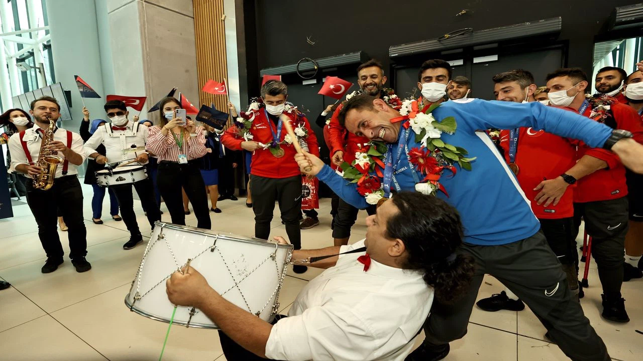 Çiçekler ve alkışlarla karşılanan kafileye bando takımı da eşlik etti. Sporcuların çıkış anında konfetiler patlatılırken, oyuncuların mutluluğu dikkatlerden kaçmadı.