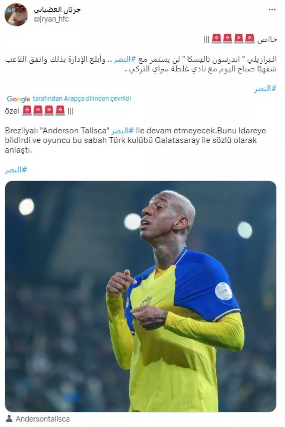 Suudi gazeteci Jryan Al-Odhiani'nin haberine göre, Suudi Arabistan ekibi Al Nassr'da Cristiano Ronaldo ile takım arkadaşı olan Talisca, kulüpten ayrılma kararı aldı. Brezilyalı yıldızın yeni adresinin ise yeniden Süper Lig olacağı söyleniyor.