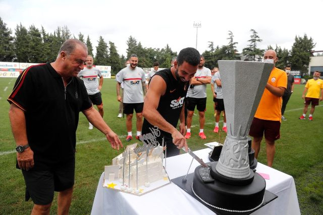 Terim için hazırlanan UEFA Kupası görünümlü pastayı, takım kaptanlarından Arda Turan keserken Galatasaray tarafından yayınlanan fotoğrafta Selçuk İnan'ın teknik heyet eşofmanlarıyla yer alması dikkat çekti.