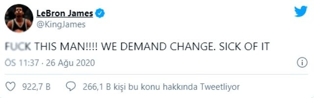 Los Angeles Lakers'ın yıldız basketbolcusu Lebron James, ABD'de yaşanan ırkçılık ve sosyal adaletsizliği prostesto etmek amacıyla Bucks-Magic maçındayapılan boykotun ardından tarihi bir tweet atarak sosyal medyada gündem oldu.