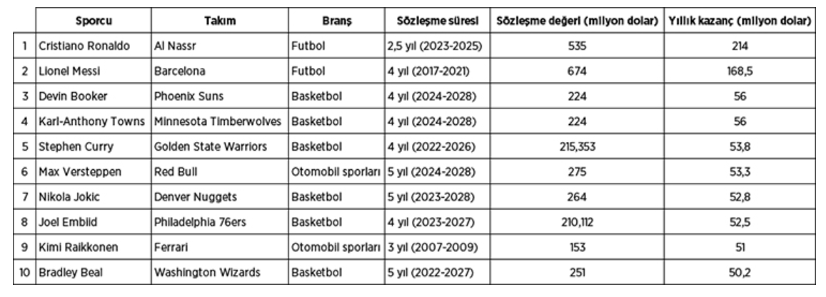 Listenin 6'ncı ve 9'uncu sırasında ise otomobil sporcuları yer aldı. Son 2 yılın F1 şampiyonu Max Verstappen'in, Red Bull ile imzaladığı 5 yıllık sözleşmeye göre sezon başına 53,3 milyon dolar kazanacağı basına yansıdı ve takım iddiayı reddetmedi.