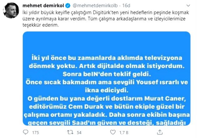 Sosyal medya hesabından konuyla ilgili açıklama yapan Demirkol, "İki yıldır büyük keyifle çalıştığım Digitürk'ten yeni hedeflerin peşinde koşmak üzere ayrılmaya karar verdim. Tüm çalışma arkadaşlarıma ve izleyicilerimize teşekkür ederim" ifadelerini kullandı.