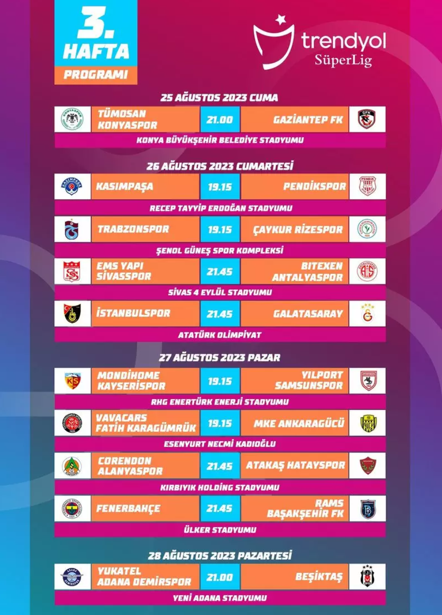"Trendyol Süper Lig'de 3. ve 4. hafta müsabaka programı belli oldu. İlk yarının kalan haftaları, 31 Ağustos'ta yapılacak olan UEFA Şampiyonlar Ligi ve 1 Eylül'de yapılacak olan UEFA Avrupa Konferans Ligi Grup Kura çekimleri sonrasında, takımlarımızın fikstürüne göre yapılacak olan çalışma sonrasında ilan edilecektir."
