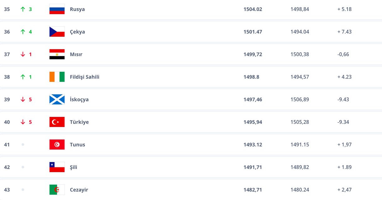FIFA tarafından açıklanan dünya sıralamasına göre 2024 Avrupa Şampiyonası'na (EURO 2024) katılacak Türkiye, geçen ay oynadığı 2 hazırlık maçını kaybederek 1495 puanla 5 basamak geriledi ve 40. sıraya yerleşti.