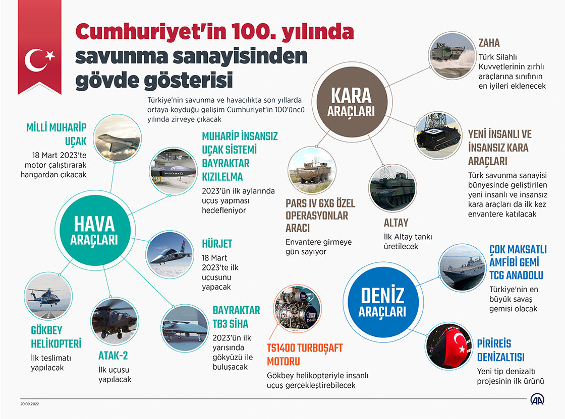 "Milli Muharip Uçak'ımızdan Kızılelma Muharip İnsansız Uçak'ımıza, gemilerimizden helikopterlerimize, kara araçlarımızdan motor projelerimize, insansız deniz ve kara araçlarımızdan denizaltılarımıza, hava savunma sistemlerimizden füze ve mühimmatlarımıza kadar savunma sanayimizin hemen her alanında yeni gelişmelere şahit olacak, milletimize yeni müjdeler vereceğiz. Türk savunma sanayisi olarak Cumhuriyet'imizin 100'üncü yılında, Cumhurbaşkanımız Recep Tayyip Erdoğan'ın liderliğinde milletimize gurur veren çalışmalarımıza hız kesmeden devam edeceğiz. Savunma sanayisinde geriden gelen değil, öncü olan Türkiye kararlılığına emin adımlarla devam edeceğiz."