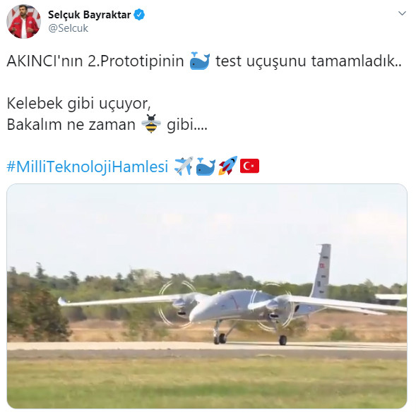 BAYKAR Savunma Teknik Müdürü Selçuk Bayraktar, resmi Twitter hesabından yaptığı paylaşımda, ''AKINCI'nın 2.Prototipinin test uçuşunu tamamladık.. Kelebek gibi uçuyor, Bakalım ne zaman gibi....'' ifadelerinde bulundu.