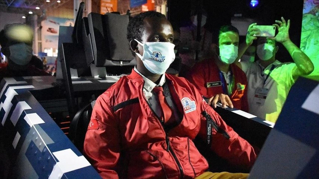Fuar merkezindeki uçak ve İHA modellerini yakından inceleyip fotoğraf çeken Somalili Abdi, uçak simülatörünü kullandı.