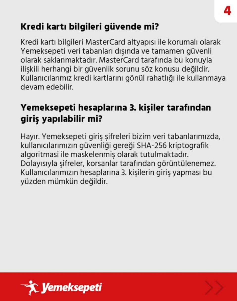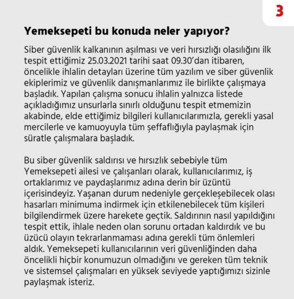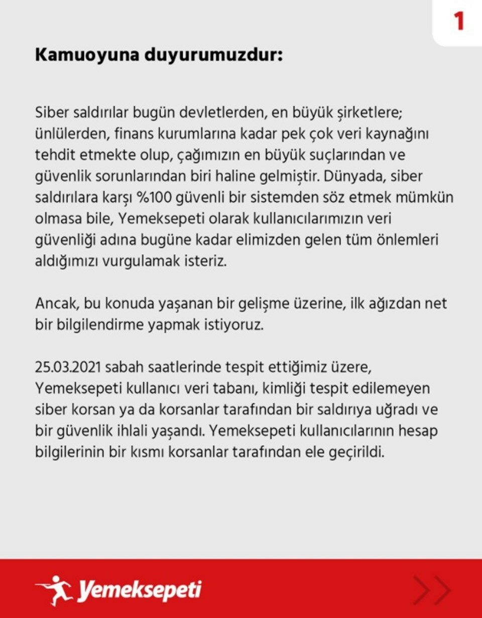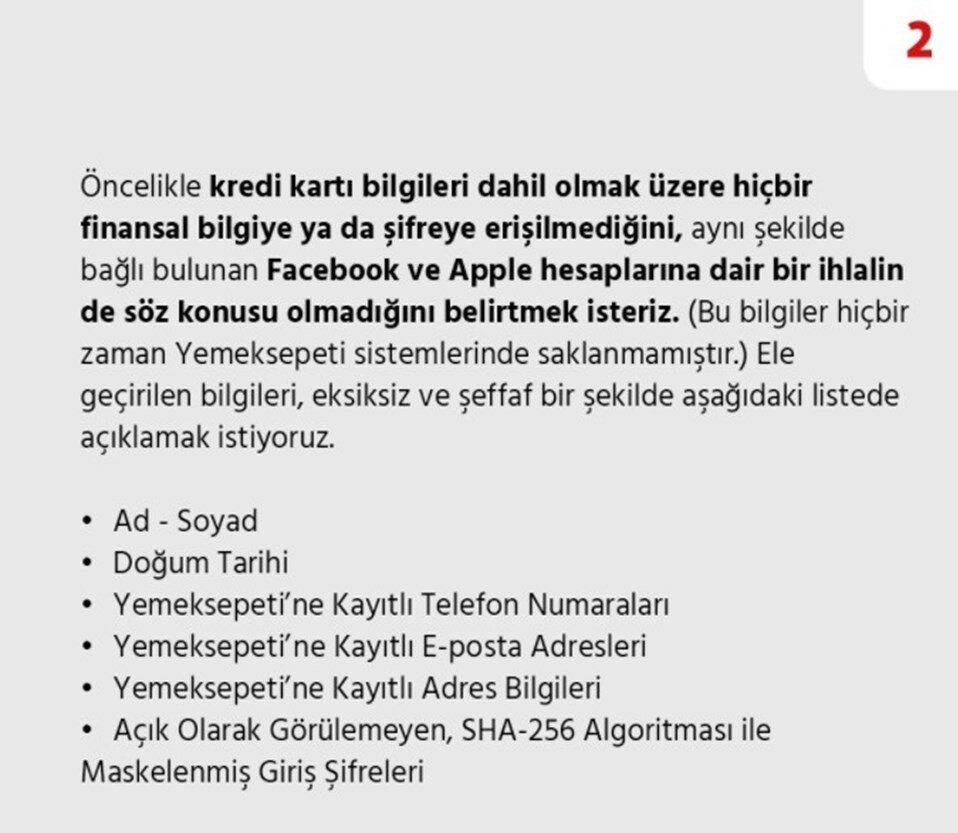Yemeksepeti'nin Twitter hesabından yapılan açıklamaya göre 25 Mart tarihinde korsanlar tarafından siteye siber saldırı düzenlendi ve kullanıcıların bazı bilgileri çalındı. Kredi kartı bilgilerinin güvende olduğunu aktaran şirket ele geçirilen bilgileri şu şekilde açıkladı: