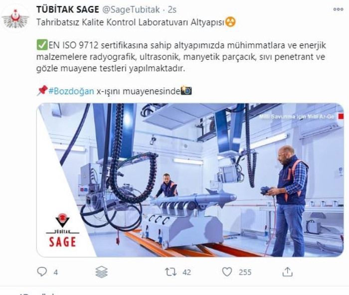 Savunma Sanayii Araştırma ve Geliştirme Enstitüsü (TÜBİTAK SAGE) hava-hava füzesi Bozdoğan'ın x-ışını muayenesine ilişkin paylaşımda bulundu.