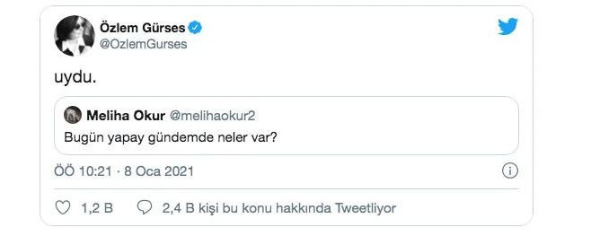 Sunucu Özlem Gürses, Twitter'daki "Bugün yapay gündemde ne var?" sorusuna '"Uydu" ifadeleriyle cevap vermesine yanıt Cumhurbaşkanı Danışmanı ve Sosyal Medya Yöneticisi İsmail Cesur'dan geldi.