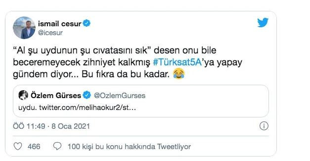 Gürses'e en güzel cevap Cumhurbaşkanı Danışmanı ve Sosyal Medya Yöneticisi İsmail Cesur'dan geldi. Cesur paylaşımı ti'ye alarak “Al şu uydunun şu cıvatasını sık” desen onu bile beceremeyecek zihniyet kalkmış Türksat 5A’ya yapay gündem diyor... Bu fıkra da bu kadar.' ifadelerini kullandı.
