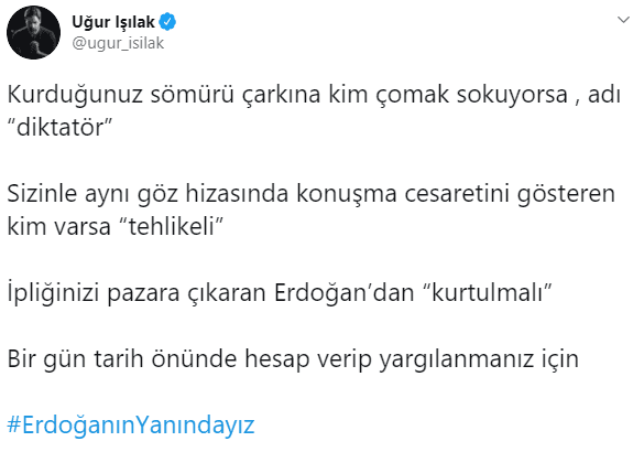 Paylaşımında Cumhurbaşkanı Erdoğan’ı öven Işılak, Erdoğan’a yöneltilen eleştirileri hatırlattı. Işılak paylaşımını “Bir gün tarih önünde hesap verip yargılanmanız için Erdoğan’ın yanındayız.” sözleriyle sonlandırdı.