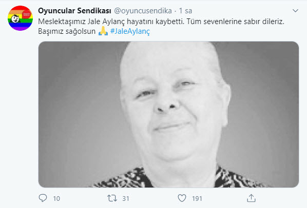 Sinema ve tiyatro oyuncusu Jale Aylanç, 72 yaşında hayata gözlerini yumdu. Unutursam Fısılda, İlk Öpücük gibi filmlerde, Dengi Dengine, Yeşil Deniz, Suskunlar gibi dizilerde rol alan Jale Aylanç, 72 yaşında hayata gözlerini yumdu. Oyuncular Sendikası, Aylanç'ın vefat ettiğini Twitter'dan yaptığı; 'Meslektaşımız Jale Aylanç hayatını kaybetti. Tüm sevenlerine sabır dileriz. Başımız sağ olsun' paylaşımıyla duyurdu.