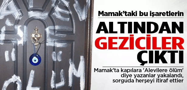 Ankara Mamak'ta Alevi vatandaşların evlerine işaret koyan iki kişi yakalandı. Gözaltına alınan M.Ü ve S.D sorguda, 'Biz de aleviyiz. Mezhep çatışması çıkarma amacımız yoktu' dedi. Şüphelilerin Gezi eylemlerine de katıldığı belirlendi. Ankara'nın Mamak ilçesinde Alevilerin yaşadığı bazı evlere kırmızı boyayla büyük harflerle, 'Alevilere ölüm' yazıldı. Bunun üzerine Ankara polisi geniş bir inceleme başlattı. Olayın gerçekleştiği çevredeki güvenlik kameraları ve MOBESE'leri inceleyen polis ekipleri, Gezi eylemlerine destek veren Halk Evleri bağlantılı 3 kişinin kimliğini belirledi.