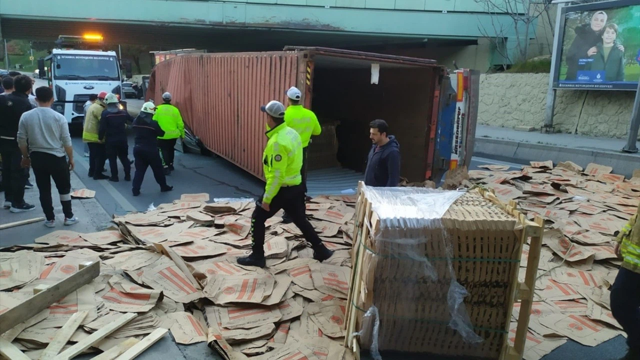 Çarpmanın etkisiyle tır, sol tarafında seyreden 34 TY 3045 plakalı otomobilin üzerine devrildi.
