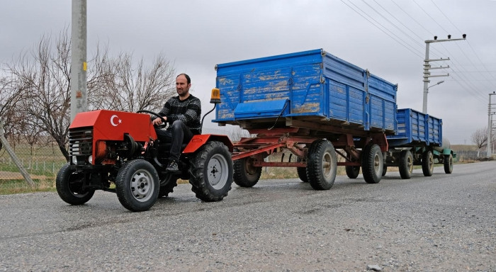 Sarayönü ilçesi Başhüyük Mahallesi'nde çiftçi Mustafa Zügül Karabaş, topladığı hurda malzemelerle evinin garajındaki hobi atölyesinde 10 vitesli mini traktör yaptı. Yaklaşık 1 yılda fırsat buldukça atölyesinde topladığı parçaları bir araya getiren Karabaş, saatte 50 kilometreye ulaşabilen mini traktörüyle büyük römorkları ve su tankerini çekiyor.