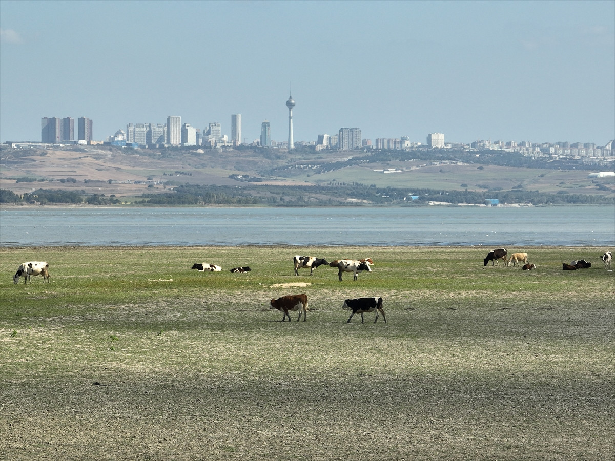 Kuruma noktasına gelen Büyükçekmece Barajı'nın su çekilen arazisinde hayvanların otladığı görüldü.