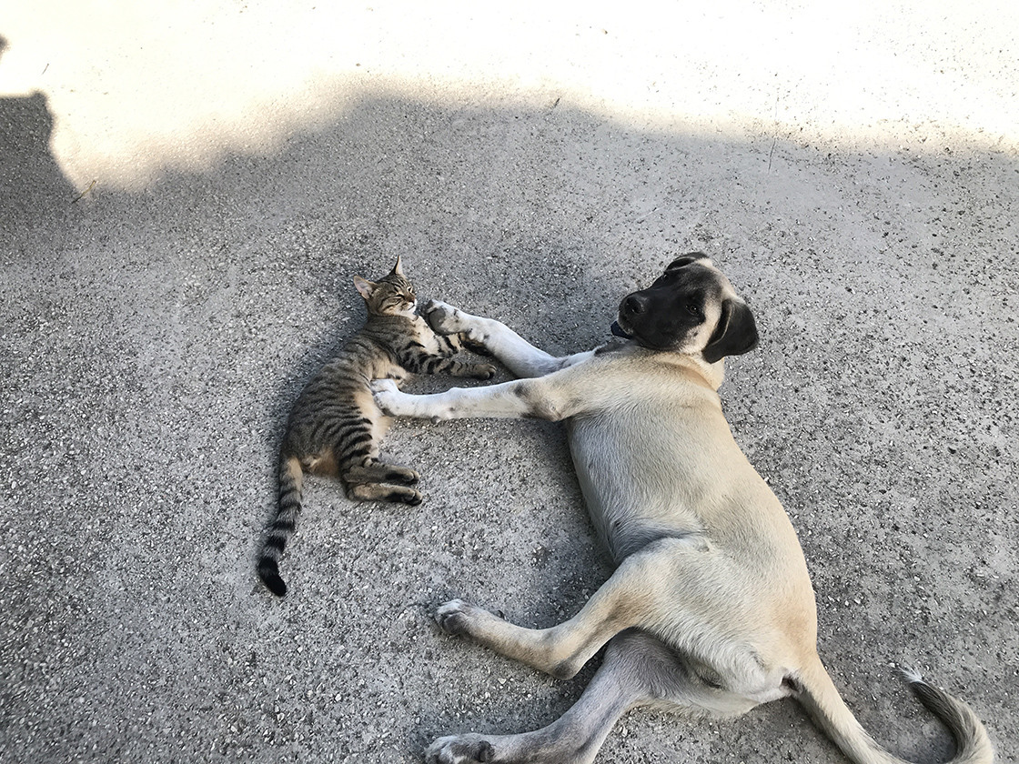 Antalya'nın Kaş ilçesinde birlikte büyüyen kedi ile köpeğin dostluğu görenleri şaşırtıyor.
