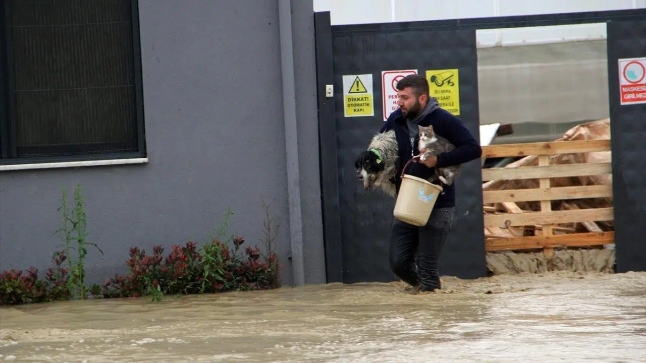 Görevliler vinç yardımıyla tesise girerek, evcil hayvanları bulundukları yerden alıp güvenli bölgeye taşıdı.