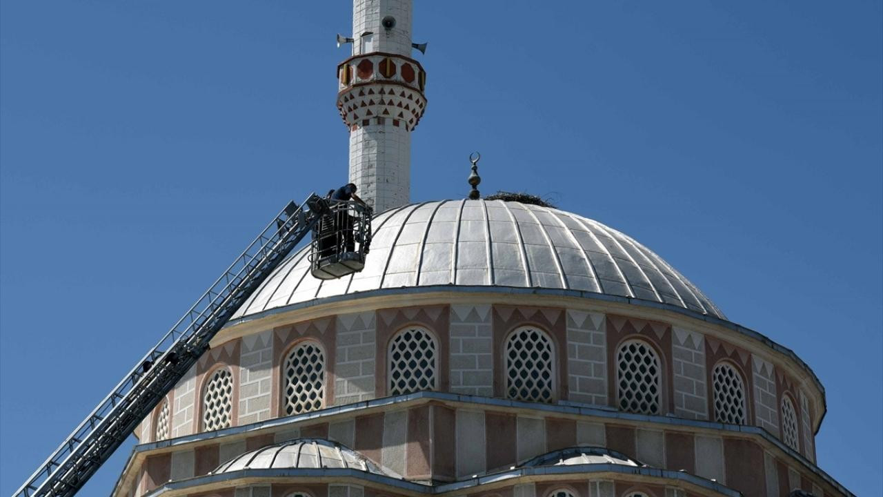 Kırıkkale'nin Bahşılı ilçesinde cami kubbesindeki yuvadan düşen leylek yavrusu, tedavisinin ardından yuvasına konuldu.