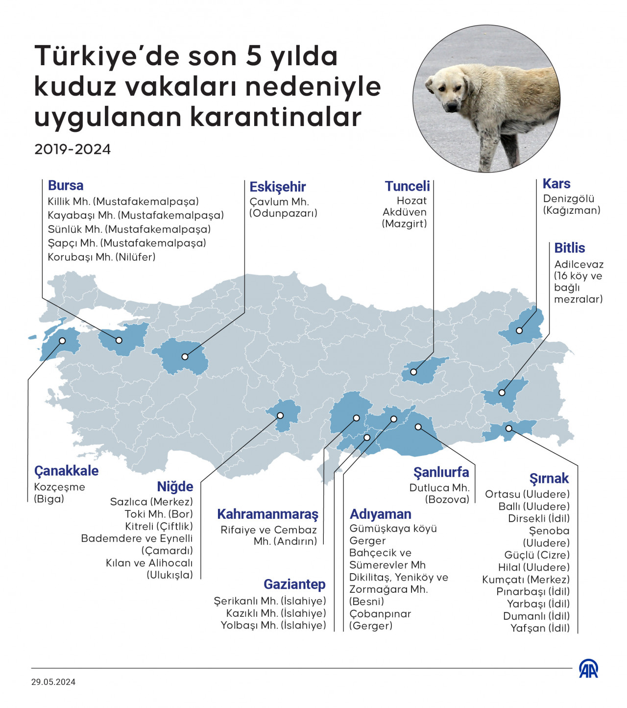 Son olarak şubat ayında Gaziantep'in İslahiye ilçesi Kazıklı Mahallesi'nde sahipsiz köpeklerin vatandaşlara saldırması üzerine 6 aylık karantinaya gidildi. Yolbaşı Mahallesi'nde de vatandaşlara saldıran köpeklerin kuduz hastalığı taşıdığının belirlenmesi üzerine 24 Mayıs'ta 6 aylık karantina uygulaması başlatıldı.