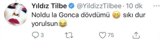 Altun Twitter hesabından yaptığı paylaşıma Yıldız Tilbe'yi etiketleyerek "Bu gece içimden geldi, ne güzel bir şarkısın sen Yıldız Tilbe" notunu düştü. Her daim esprili kişiliğiyle tanınan Yıldız Tilbe ise paylaşıma "Ne oldu la Gonca dövdü mü, sıkı dur yorulsun" yorumunu yaptı. Tilbe'nin yaptığı yorumu kısa sürede silmesi ise dikkat çekti.